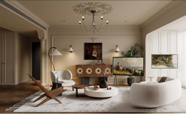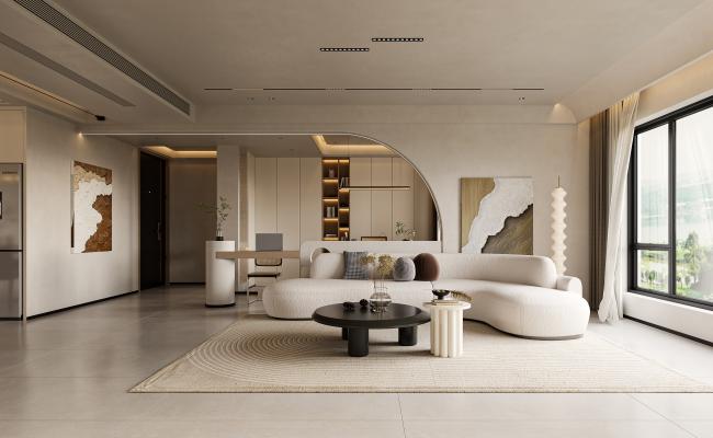將家打造成一幅隨著天光變幻的動態映畫。設計著重于框景與引光,利用連續的落地窗與法式雙開門,將外部景致與天光框定為室內流動的巨畫。家具線條優雅纖巧,融入藤編、亞麻等自然材質。空間在晨昏晴雨的光影演繹下,每一刻都呈現不同的法式電影畫面感。
