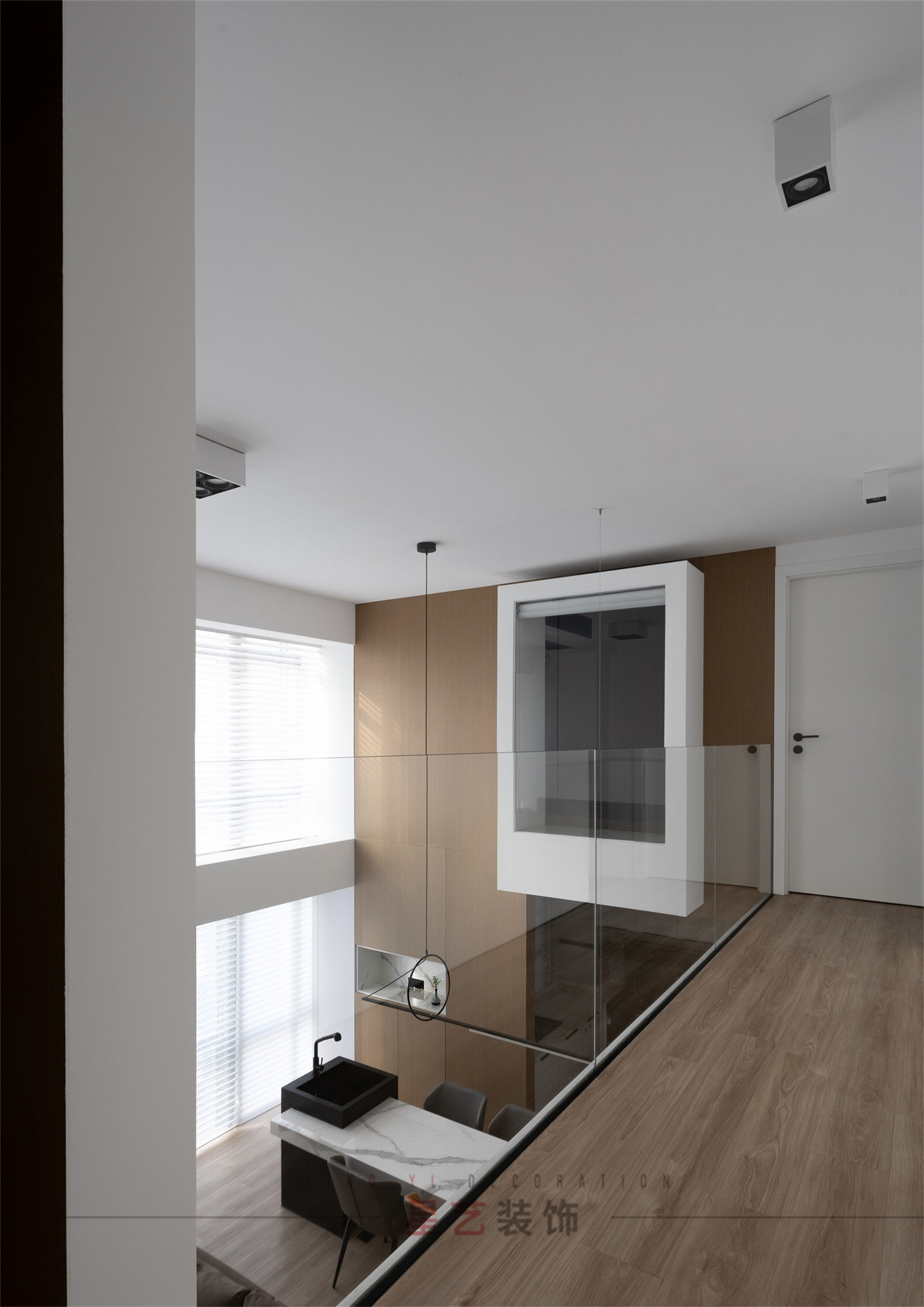 客廳:簡潔的設計,大面積的百葉窗制造極好的光影效果,不管任何天氣都擁有最佳的采光,內嵌的電視機搭配下沉式空間的處理手法帶給業主沉浸的舒適體驗,主色調黑白灰,在各個區域中都有獨立的對應系,精簡而規整,大方而得體。