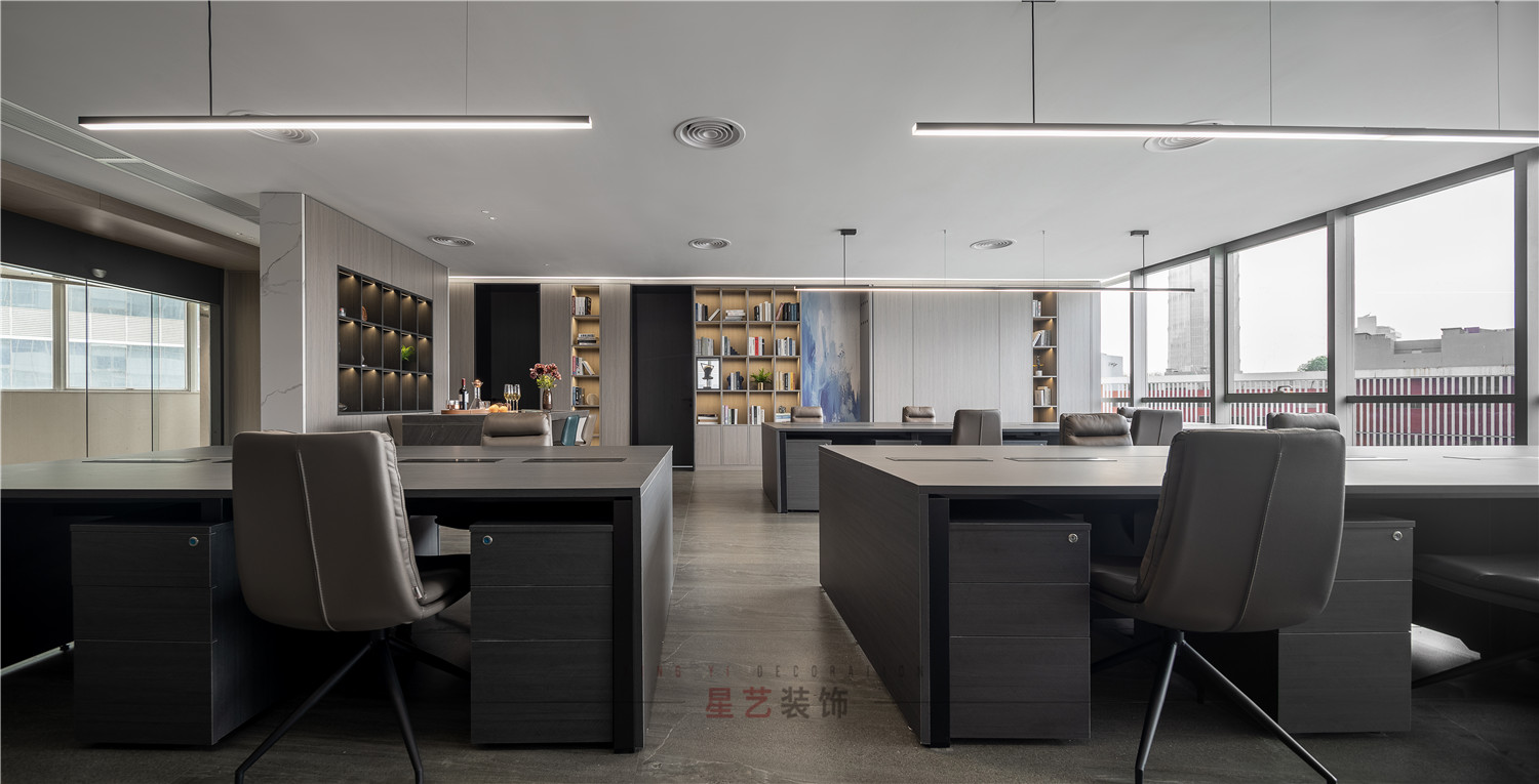 會(huì)議區(qū)也可作為接待區(qū),休息區(qū),學(xué)習(xí)區(qū),隱形儲(chǔ)物柜實(shí)用又美觀,整面的落地窗讓整個(gè)空間干凈明亮,既能享受家的愜意,也能減少工作帶來(lái)的的浮躁與不安。